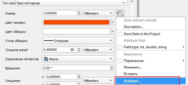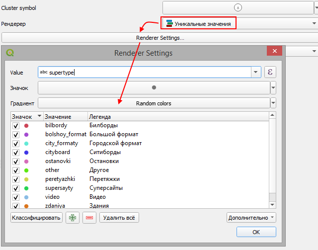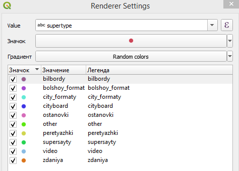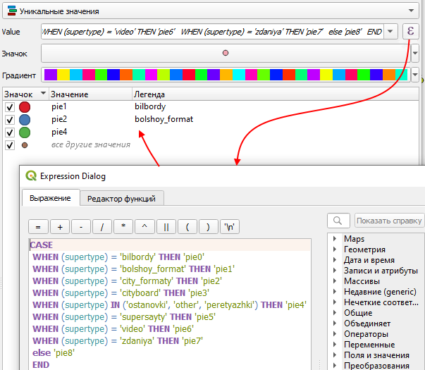 Для настройки раскраски сегментов круговой диаграммы нужно убедиться, что в свойствах слоя в разделе