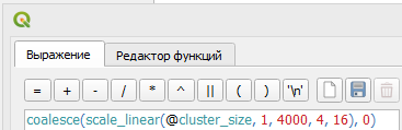 По умолчанию размер кластера и значение в подписи зависят от количества объектов, попавших в кластер. Существует возможность задавать размер кластера на основе суммы значений из указанного поля всех объектов, попавших в кластер, и выводить это значение в подпись кластера.