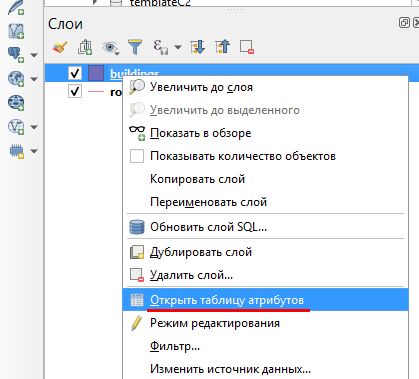 Далее для каждого слоя необходимо задать наличие и правильный порядок полей. Для этого из контекстного меню слоя нужно открыть таблицу атрибутов (см.