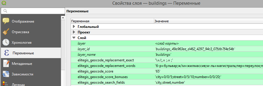 - elitegis_geocode_replacement_words - строка из набора пар по формуле "<Что_заменить>=<На_что_заменить>;" для замены слов или части слов в поисковом запросе на то, как они встречаются в атрибутах.