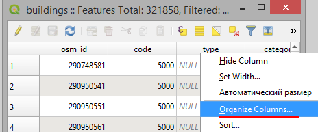 Далее в таблице атрибутов из контекстного меню для заголовков колонок необходимо выбрать пункт