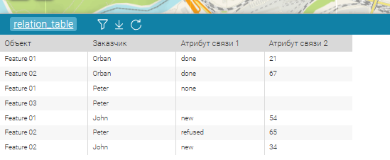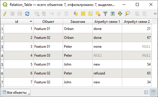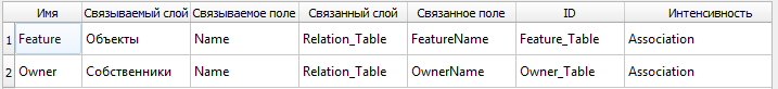 Рисунок 18 - Пример созданной промежуточной таблицы (здесь - ключевое поле первого связываемого набора данных FeatureName с псевдонимом Объект, ключевое поле второго связываемого набора данных OwnerName с псевдонимом Заказчик, а также два добавленных атрибута связи)