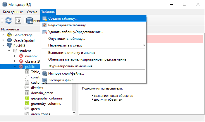 - В Менеджере БД (меню База данных > Менеджер БД ) в схеме данных выбранной базы данных создайте промежуточную таблицу (меню Таблица > Создать таблицу ), см. Рисунок 17 :