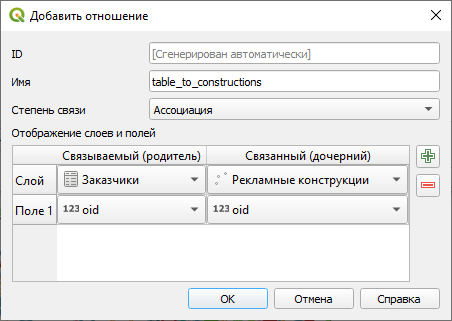 - Аналогично настройте отношение «один-ко-многим», связывая второй набор данных ( Связываемый слой (родитель)) с созданной промежуточной таблицей ( Связанный слой (дочерний)) по выбранному ключевому полю (см. подробнее п. 3.4.1 ).