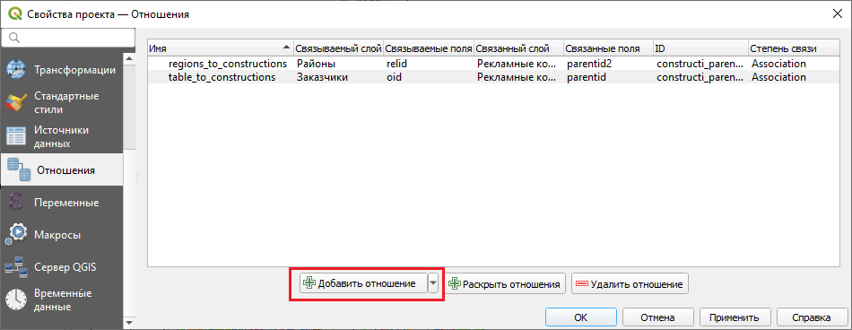 - В свойствах картографического проекта (меню Проект > Свойства ) в разделе Отношения (см. Рисунок 15 ) нажмите Добавить отношение (см. Рисунок 16 ).