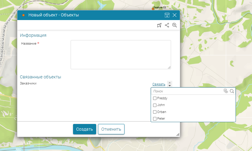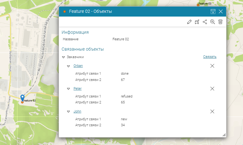при редактировании объектов связываемых наборов данных. Благодаря добавленным к слою промежуточной таблицы переменным и настроенным отношениям, при редактировании объектов первого набора данных в интерактивной карте в
