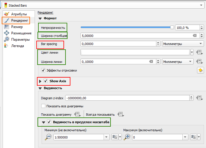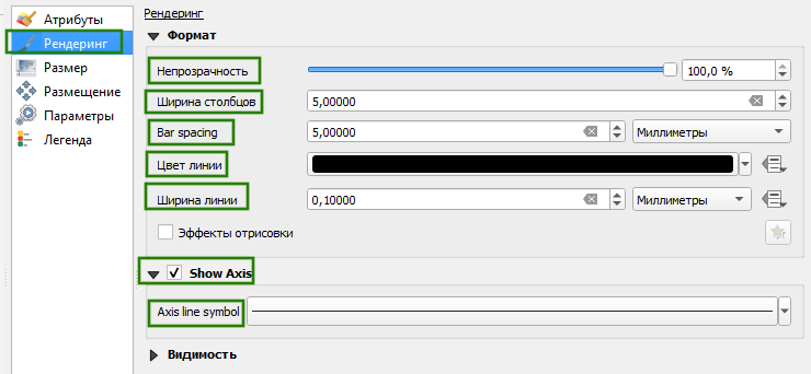 - Рендеринг: доступны только настройка непрозрачности, ширина столбцов, цвет и ширина обводки, видимость в пределах масштаба. Недоступны: расстояние между блоками (всегда вплотную), Отрисовка осей (всегда отрисовывается без осей).