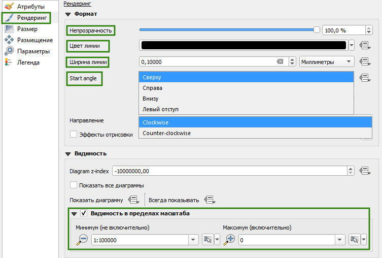 - Рендеринг: настройка прозрачности, цвета линии обводки pie (куска), ширины линии, начала отсчета диаграммы (Start Angle), направления (по/против часовой стрелки) и видимости диаграммы в пределах масштаба, см. Рисунок 86 .