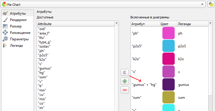 - Атрибуты: выбор необходимых полей для диаграммы и цвета для них. Также доступно задавать expression для пункта диаграммы, см. Рисунок 85 .