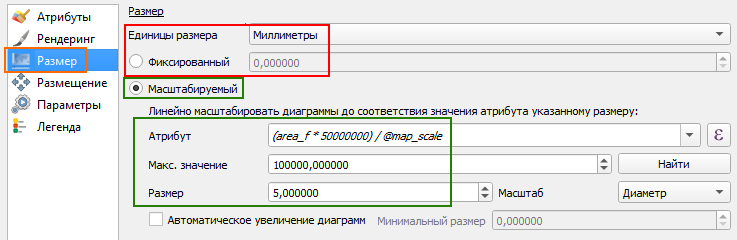 - Размер: настройка “Фиксированный размер” не поддерживается, вместо неё фиксированный размер можно указать в окне “Атрибут” масштабируемого размера. Также в окне “Атрибут” можно указать выражение, по которому будет рассчитан размер диаграммы, поддерживается переменная @map_scale - текущий масштаб карты. См. Рисунок 91 .