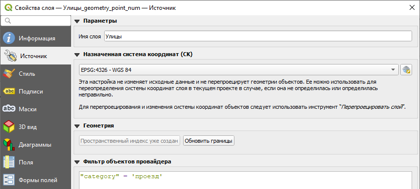 В QGS-проекте в свойствах слоя можно установить или изменить систему координат для данного слоя: раздел