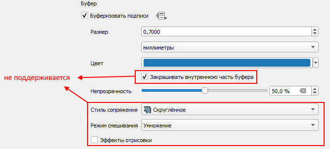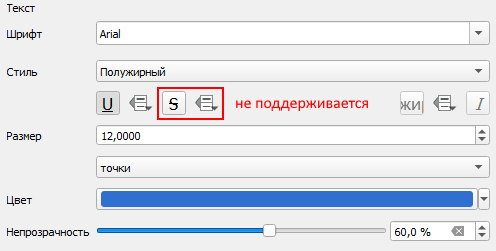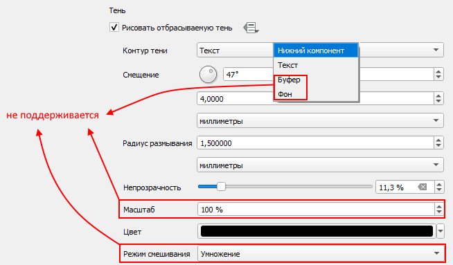 поддерживает следующие настройки подписей, заданные на уровне картографического проекта в QGIS: