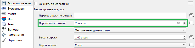 - Надписи переносятся с указанным количеством знаков как «Максимальная длина строки» высотой в 1 строку с выравниванием «Слева».
