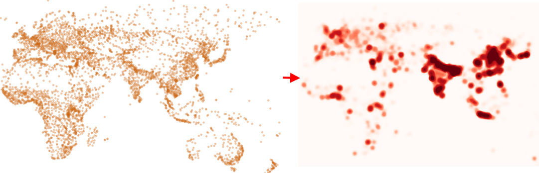 Термокарты используются для визуализации скоплений точечных данных и идентификации высокой концентрации деятельности, см.