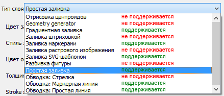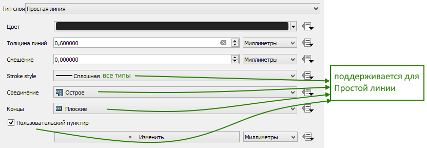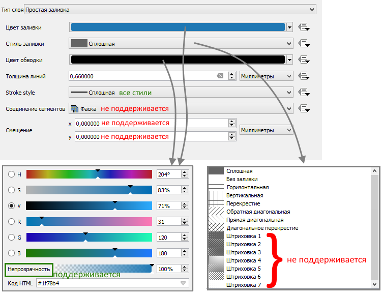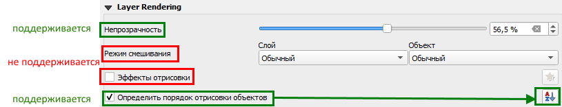 поддерживает некоторые параметры отрисовки для всего слоя, заданные на уровне картографического проекта в QGIS, см.