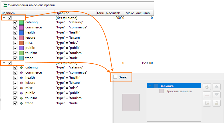 Для каждого символа кроме sql-фильтра можно указать также диапазон масштабов, и установить каскадность правил, для наглядного разделения раскраски для разных масштабов. Дочерние правила применяются в отрисовки только когда подходит все родительские правила (вверх по иерархии) - как с точки зрения масштабов, так и по sql-фильтру. Чтобы групповой символ не отображался в легенде и на карте, его необходимо выключить, см