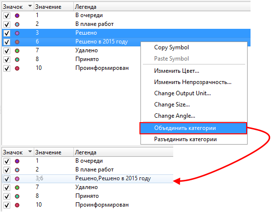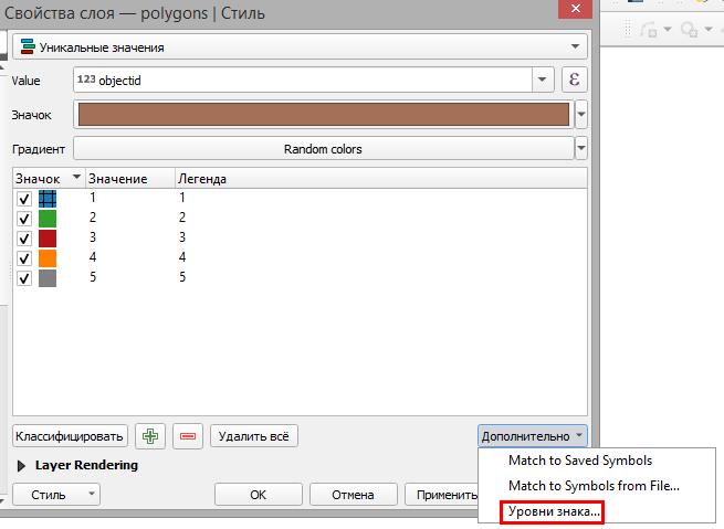 Порядок отрисовки может быть задан не только для уникальных значений, но и для всех слоёв символики, таким образом «перемешиваются» разные уровни символов в разных уникальных значениях, см.