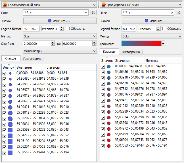 Градуированный знак устанавливается для отображения количественных различий между картографируемыми объектами посредством изменения цвета или размера символов. Данные классифицируются на диапазоны, каждому из которых назначается свой цвет цветовой схемы или размер, см.