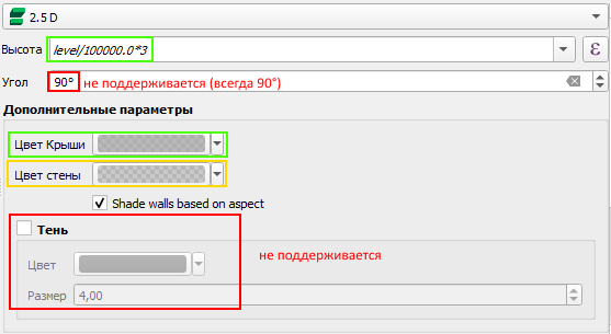 поддерживает заданную на уровне QGS-проекта символику слоя в виде псевдообъема. Это возможность отображать псевдо 3D-фигуры на основании площадных объектов с заданной высотой. Основное применение - отображение 3D-зданий на основе их высоты (этажности), см.
