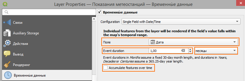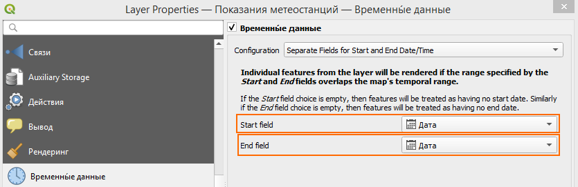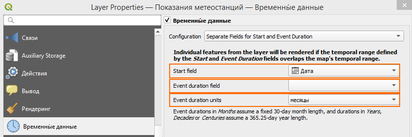 - Использование полей слоя для начального значения диапазона и поля для значения интервала времени (Separate Fields for Start and Event Duration), см. Рисунок 111 .
