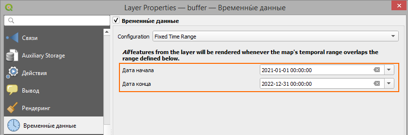 Рисунок 111 - Настройка использования полей слоя для начального значения диапазона и поля для значения интервала времени