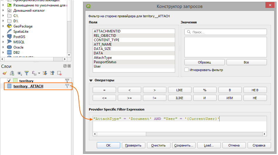 Фильтр необходимо задавать для добавленной в проект QGIS таблицы вложений.