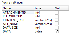 Для хранения вложений в базе данных создаются отдельные таблицы для каждого класса объектов, к которым требуется прикреплять вложения.