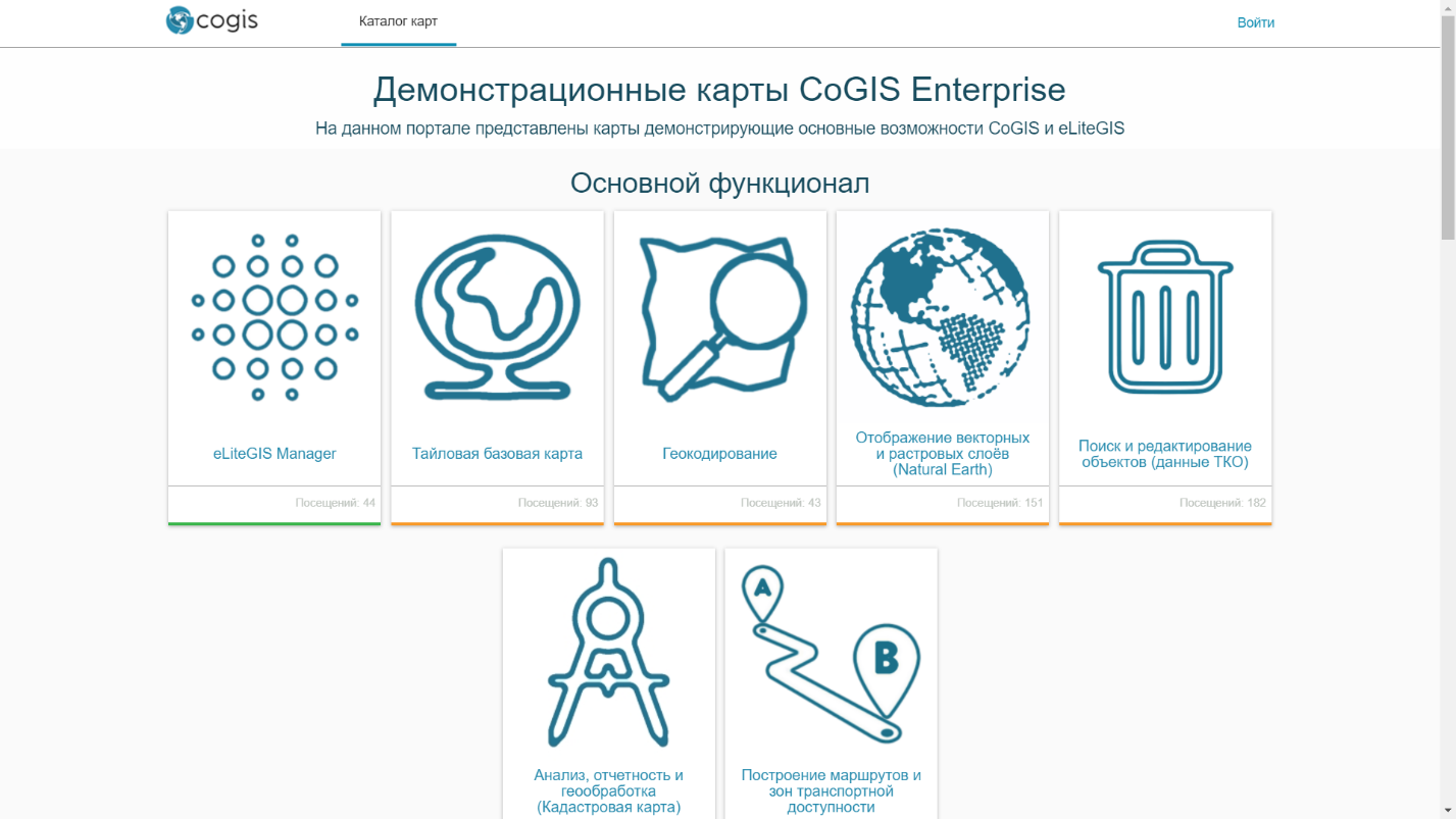 является единой точкой доступа пользователей к опубликованным средствами платформы ресурсам: интерактивным картам, картографическим веб-приложениям, веб-страницам, документам, ссылкам на внешние источники.
