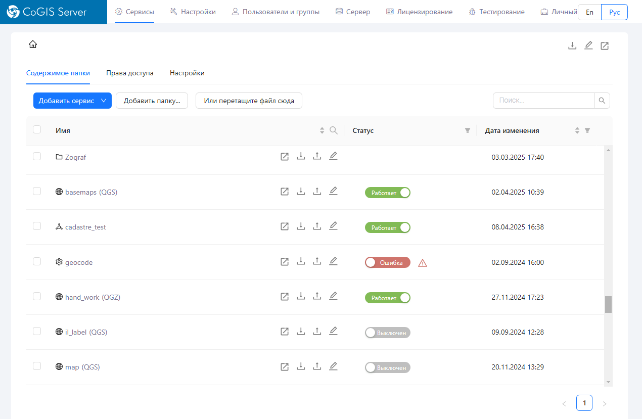 Список сервисов и их группировка соответствуют списку файлов и их группировке по папкам в заданной директории на сервере. Соответственно, управлять списком сервисов (создавать новый, удалять, переименовывать, менять структуру) можно несколькими способами: