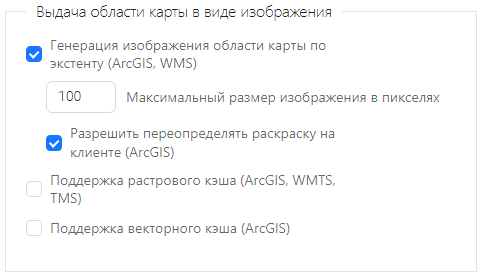 - Для данной операции доступна дополнительная настройка Разрешить переопределять раскраску на клиенте (ArcGIS REST API) - для сервисов типа MapServer и FeatureServer можно разрешить или запретить переопределять раскраску слоев на клиенте. По умолчанию настройка включена.