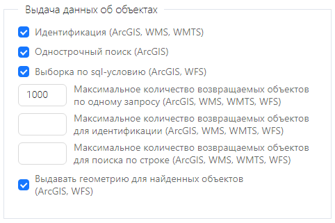 - Максимальное количество возвращаемых объектов по одному запросу (ArcGIS, WMS, WMTS, WFS) ;