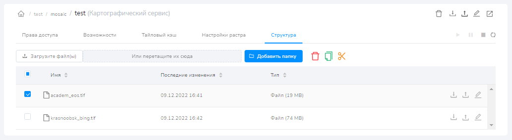 Данный раздел позволяет управлять содержимым картографического сервиса мозаики: настраивать структуру каталога, добавлять, удалять, переносить, копировать, редактировать растры из набора для картографического сервиса мозаики. Общие принципы и инструменты аналогичны управлению