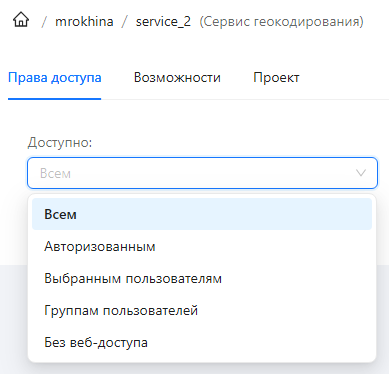 По умолчанию доступ к сервису разрешен для всех пользователей. Уровень доступа можно изменить, выбрав один вариант из списка: