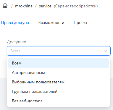 По умолчанию доступ к сервису разрешен для всех пользователей. Уровень доступа можно изменить, выбрав один вариант из списка: