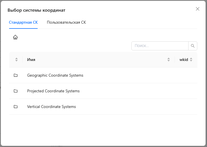 . Для выбора другой системы координат нажмите на название системы координат либо ее идентификатор (WKID). В открывшемся окне