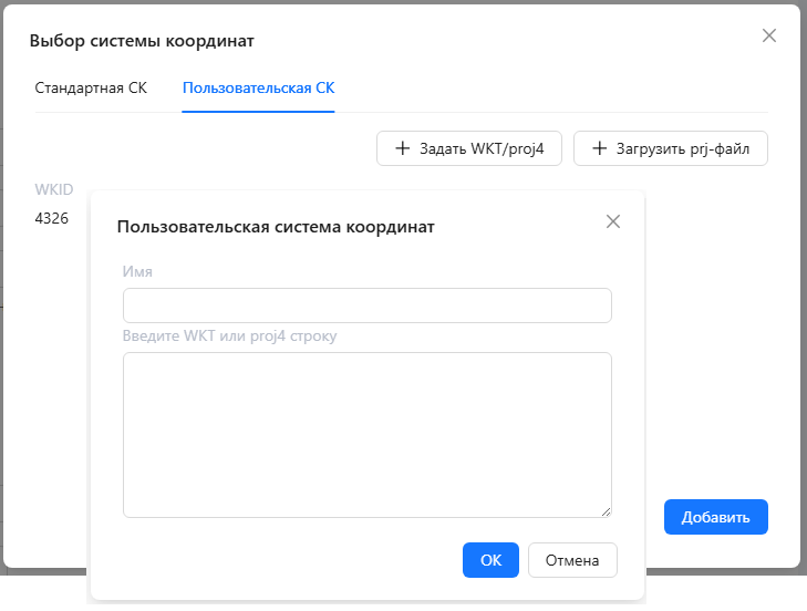 загрузить параметры координатной системы в формате WKT или proj4 по кнопке