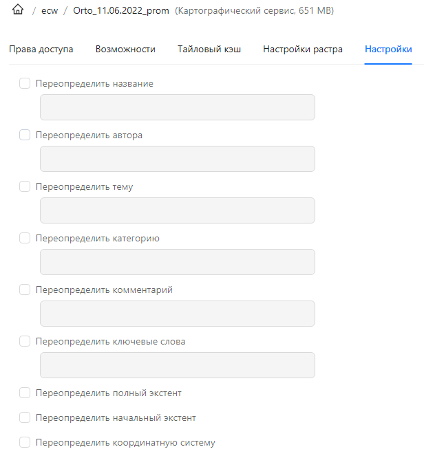 Для переопределения координатной системы сервиса, помимо вышеозначенных способов, можно также добавить prj-файл с параметрами нужной системы координат в папку ГИС-сервера рядом с самим сервисом (по кнопке