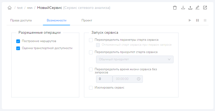 Для перехода к настройке возможностей сервиса необходимо нажать на его имя в списке. Будет открыто окно свойств сервиса. Далее необходимо перейти к разделу