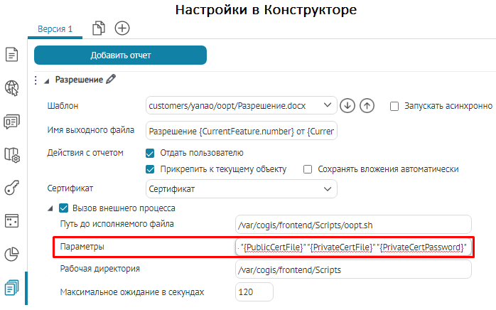 - Для добавленного внешнего исполняемого файла (настройка Внешнего процесса ) добавьте в опции Параметры дополнительные макросы по техническому сертификату с ЭЦП для сгенерированного файла отчета в формате .pdf (см. Рисунок 550 ):