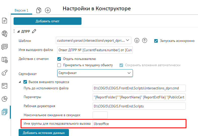 - Имя группы для последовательного вызова - укажите при необходимости имя группы, тогда при многопроцессорном запуске будет выстроена очередь из всех параллельных вызовов генерации отчетов для их последовательного запуска, но только для заданной группы. Например, генерация . pdf из . docx средствами LibreOffice , см. Рисунок 549 . По умолчанию группа не задана, тогда выстраивание в очередь не производится, при этом запуск будет произведен безотлагательно.