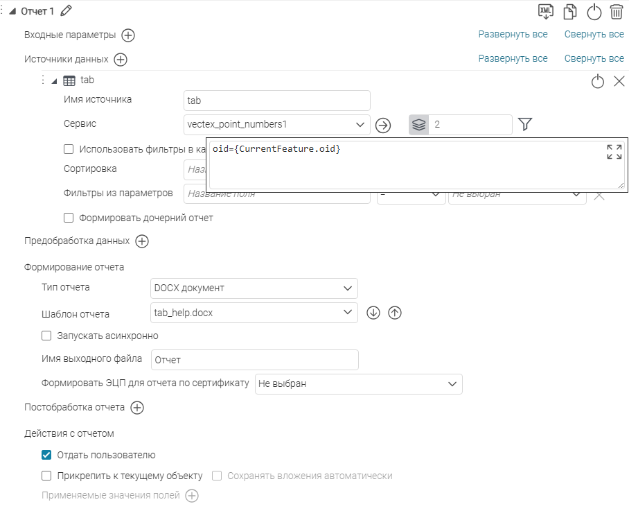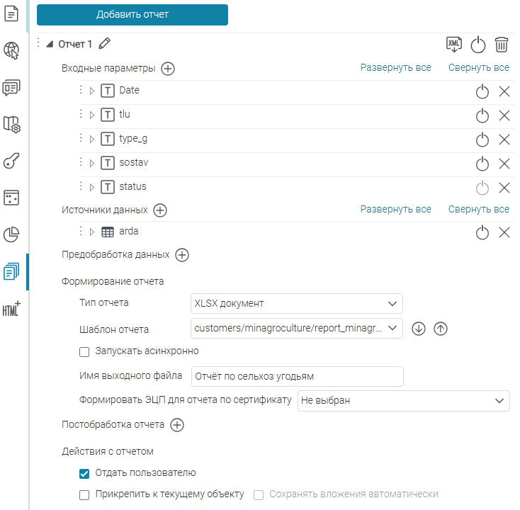 После того, как отчет сформирован, вы можете настроить дополнительную обработку отчета (например, отправить отчет на печать) в разделе