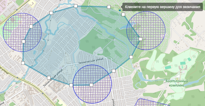 Инструмент автозавершения геометрии позволяет создавать новый топологически корректный полигональный объект, имеющий общие сегменты границы с соседними полигональными объектами из этого же или других выбранных слоев картографических сервисов карты (см.