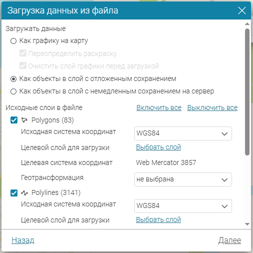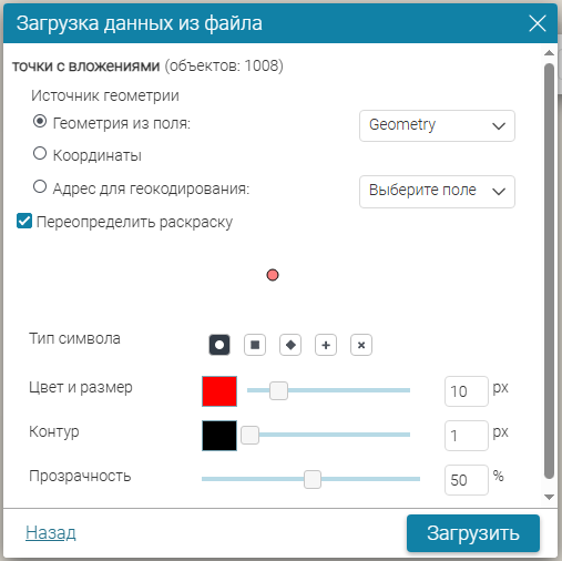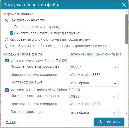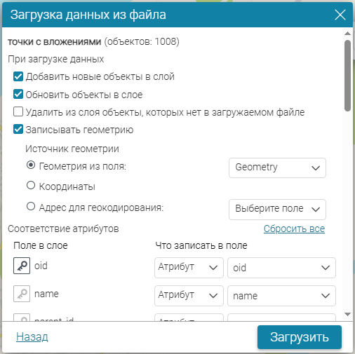 По умолчанию для атрибутивного поля целевого слоя автоматически подхватывается атрибут загружаемого набора данных с совпадающим именем. Но можно выбрать из выпадающего списка другой атрибут, если требуется.