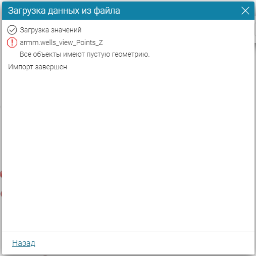 , чтобы завершить процесс загрузки данных в слой. При возникновении ошибок загрузки в окне инструмента появится соответствующее сообщение (см.