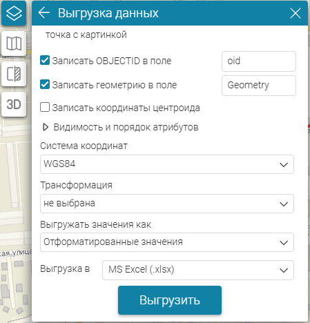 Выгрузка данных происходит в файл заданного формата с именем по умолчанию, соответствующим имени выгружаемого слоя.