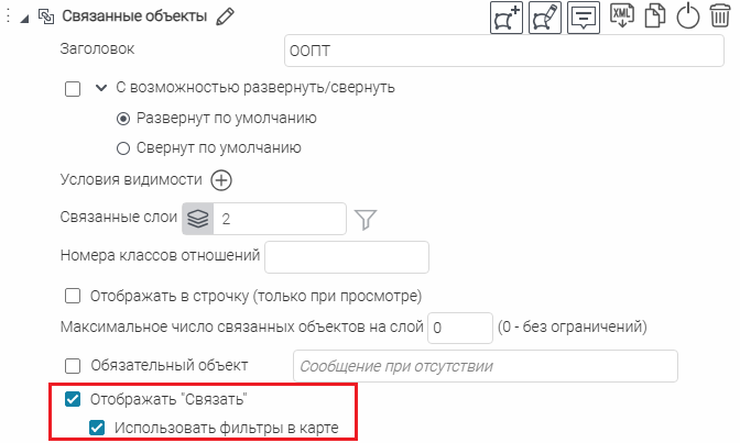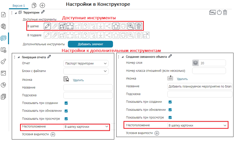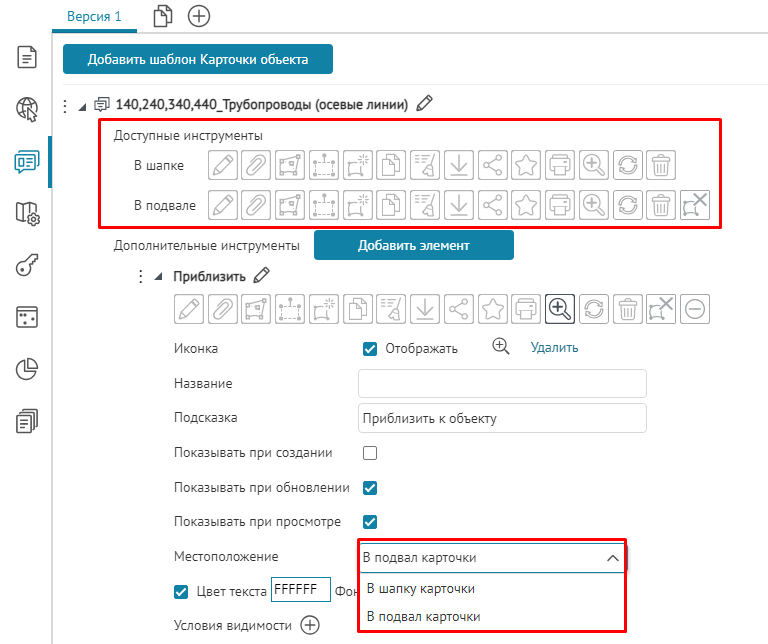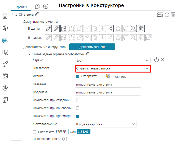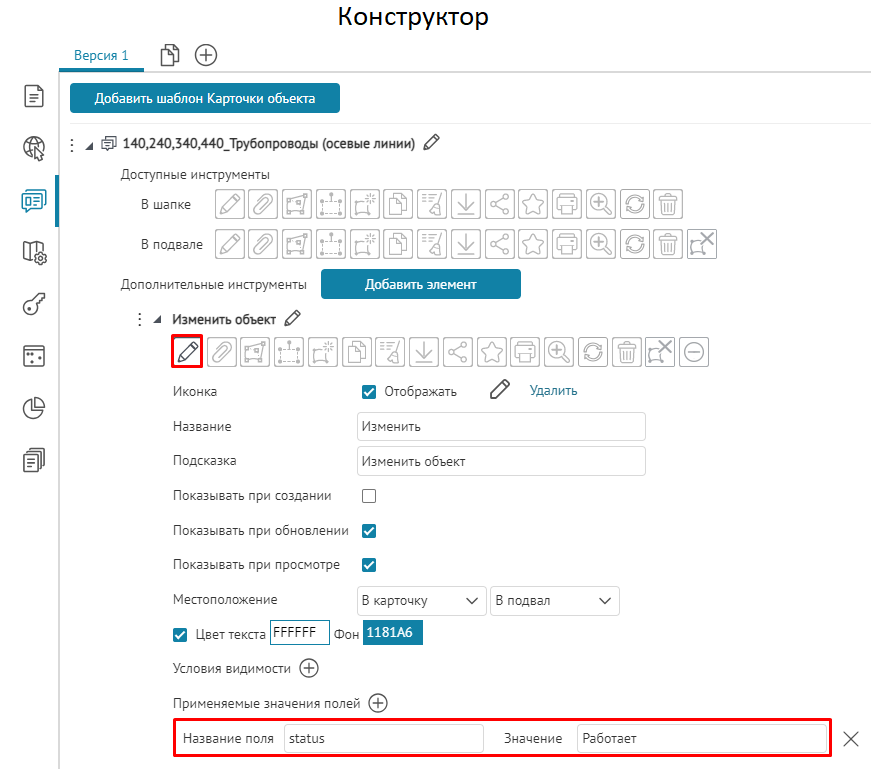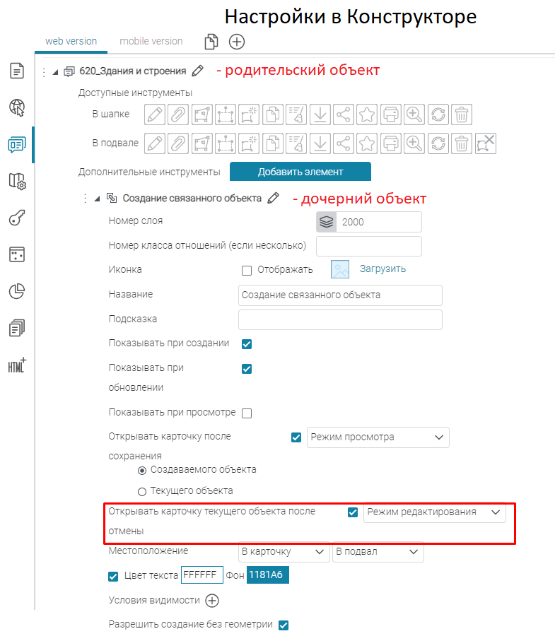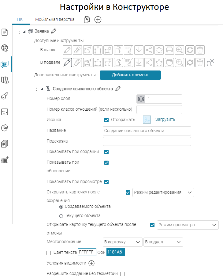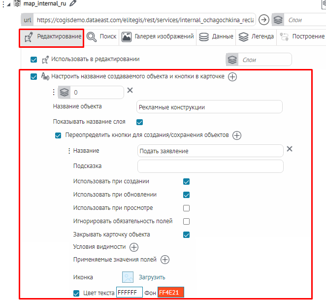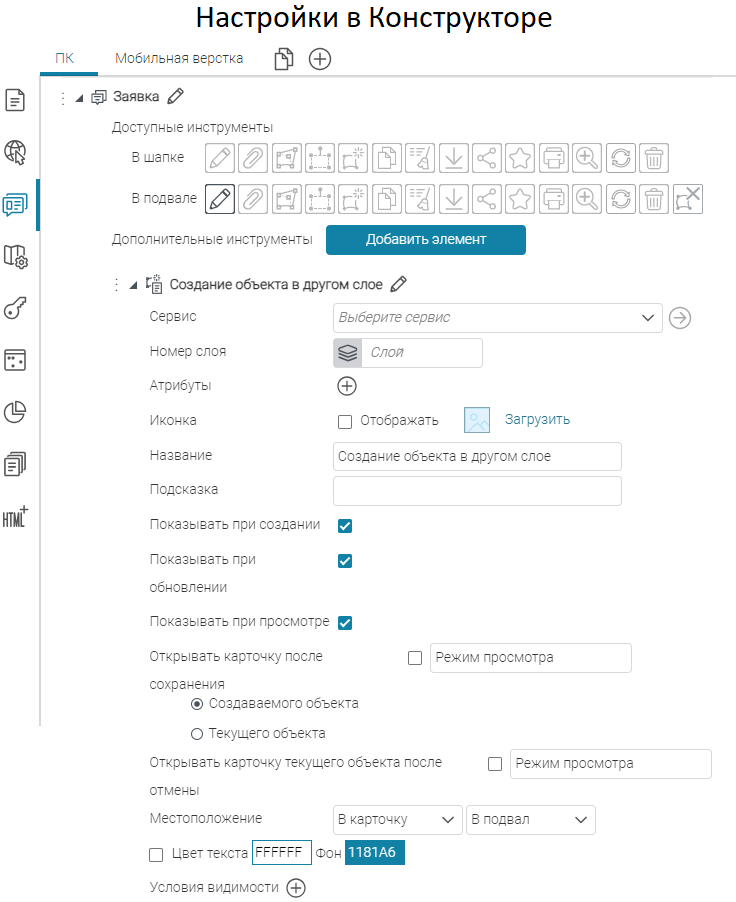 Что касается специальных кнопок создания или сохранения объектов или атрибутивных полей для редактирования, то слой, на значения атрибутивных полей которого будут назначены условия, указывается непосредственно при настройке.