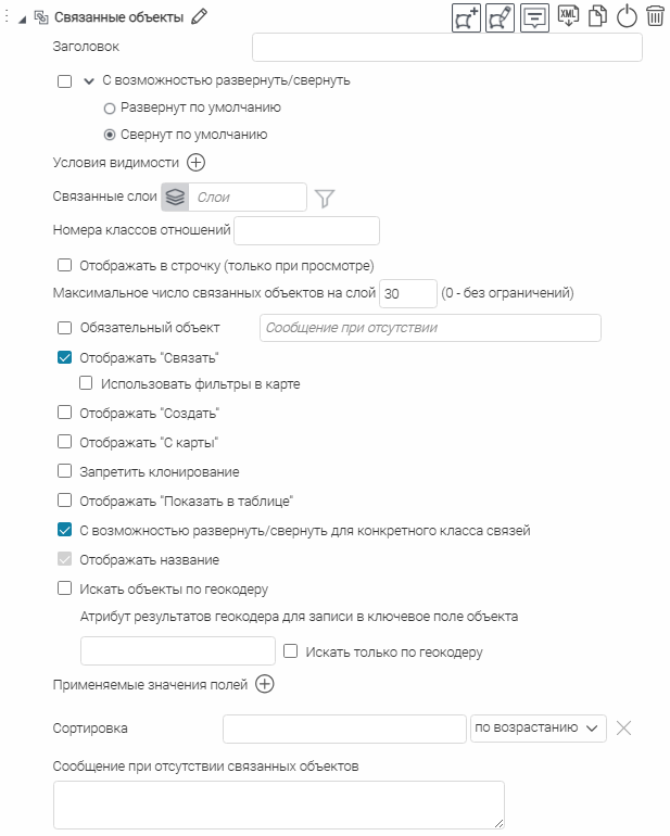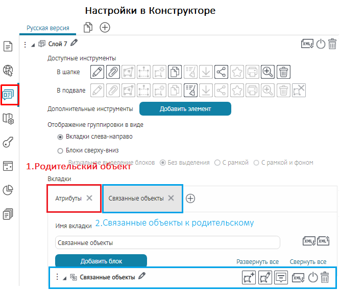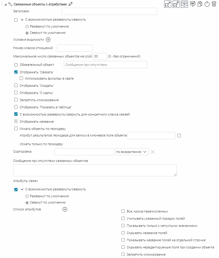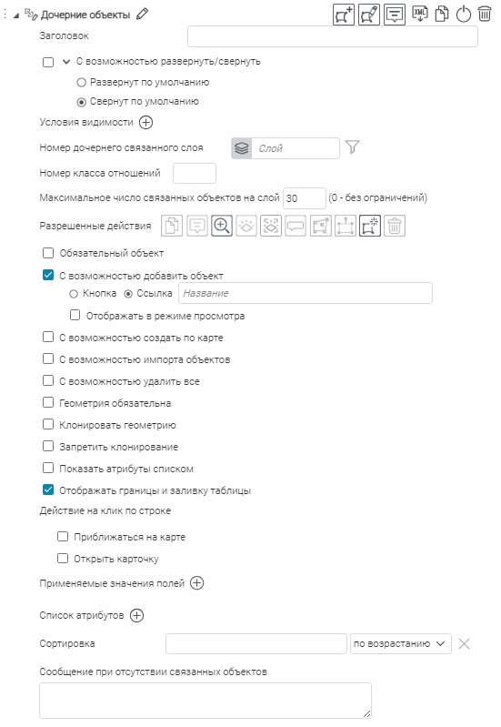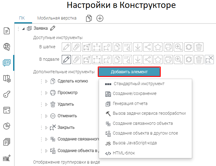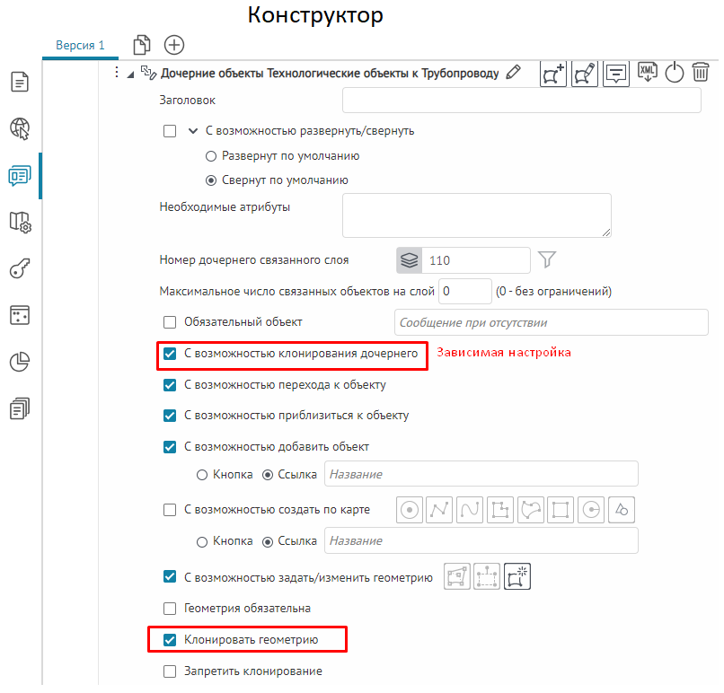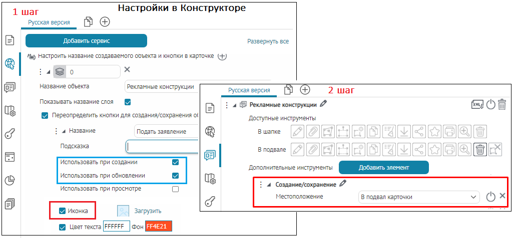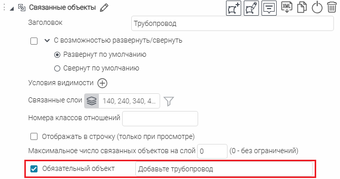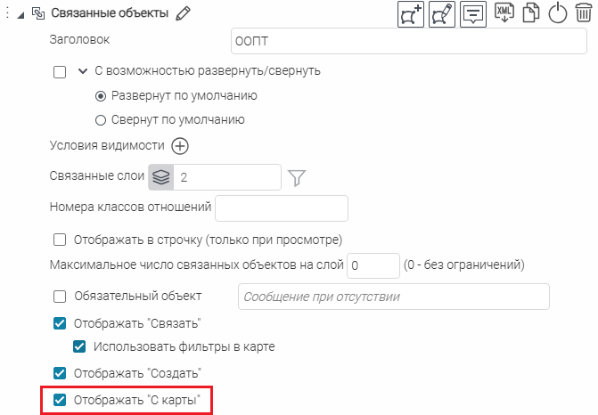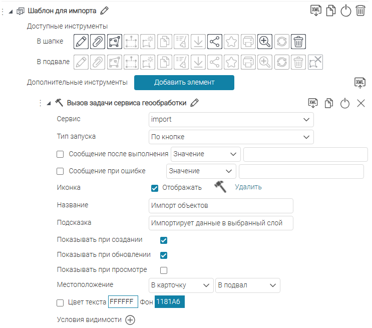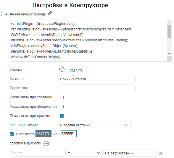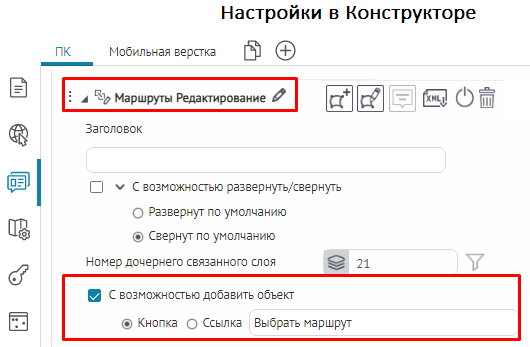 Что касается специальных кнопок создания или сохранения объектов или атрибутивных полей для редактирования, то слой, на значения атрибутивных полей которого будут назначены условия, указывается непосредственно при настройке.
