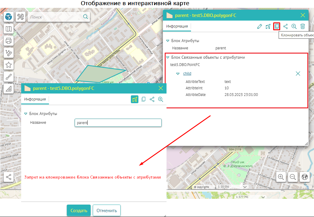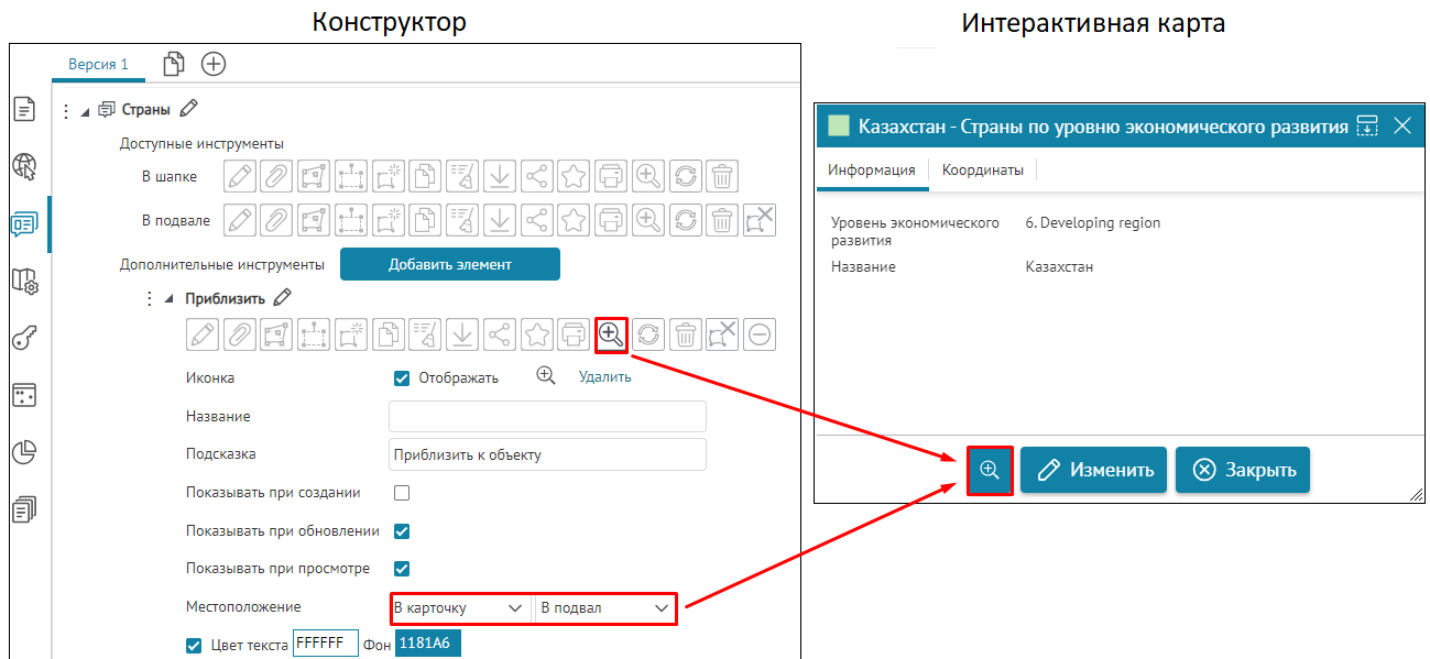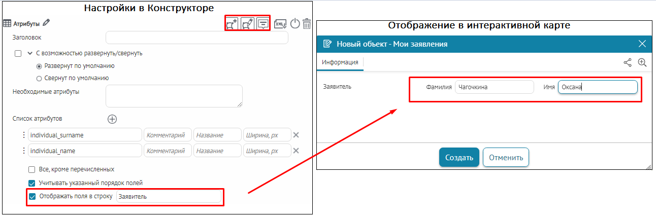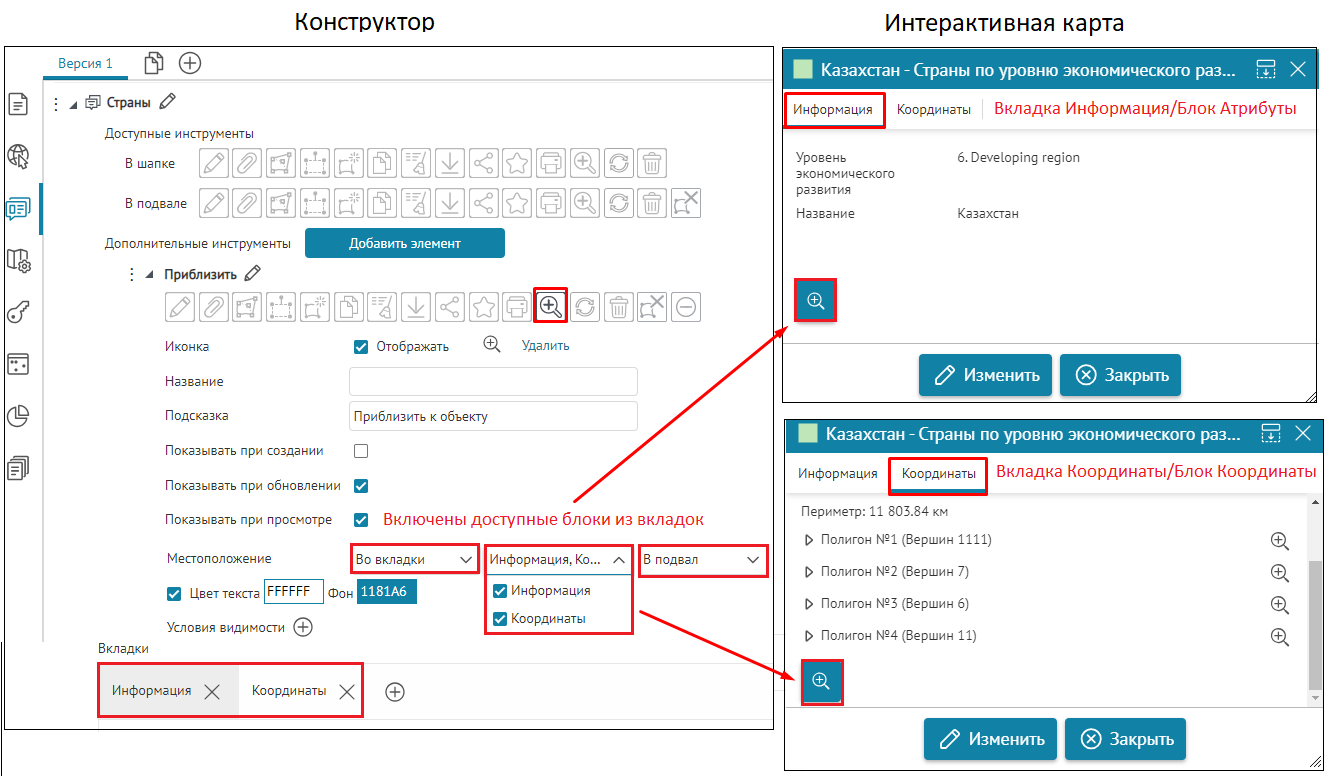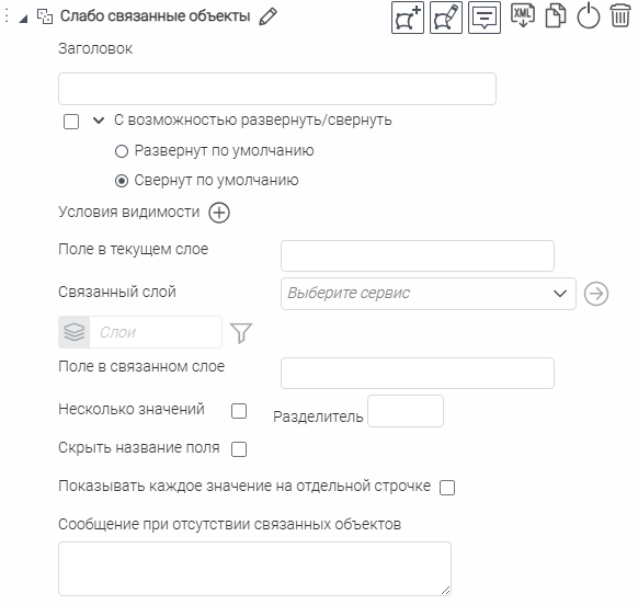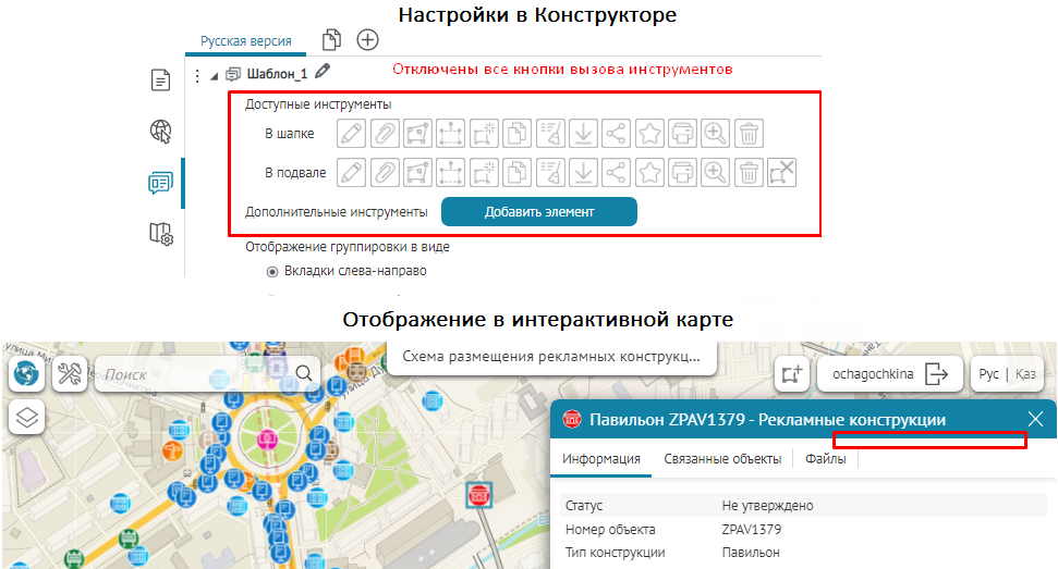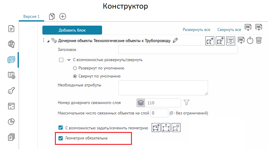Что касается специальных кнопок создания или сохранения объектов или атрибутивных полей для редактирования, то слой, на значения атрибутивных полей которого будут назначены условия, указывается непосредственно при настройке.