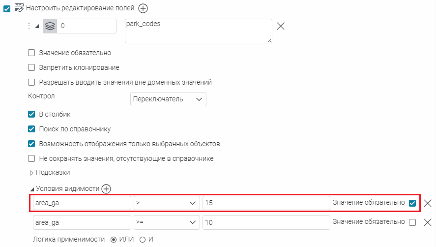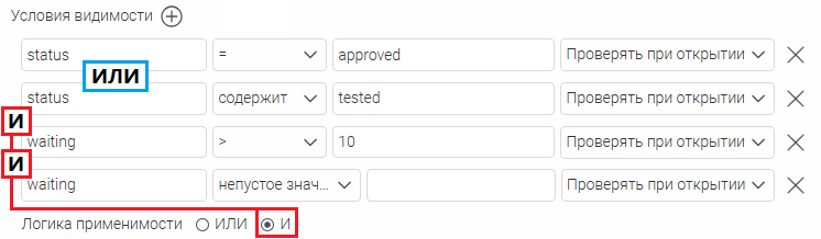 Можно задать несколько условий видимости. В этом случае необходимо выбрать