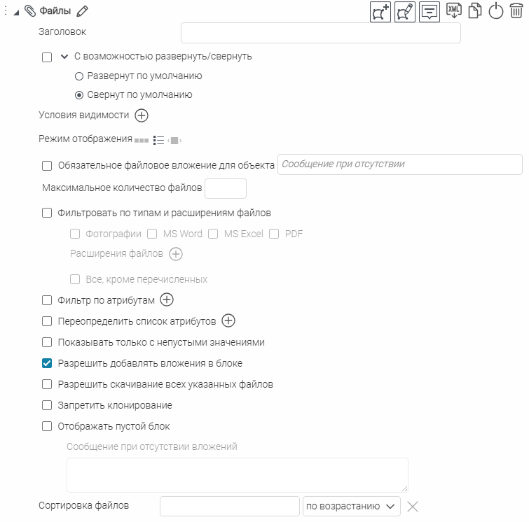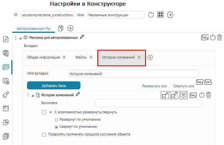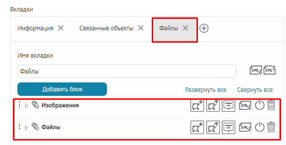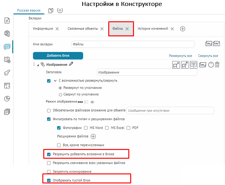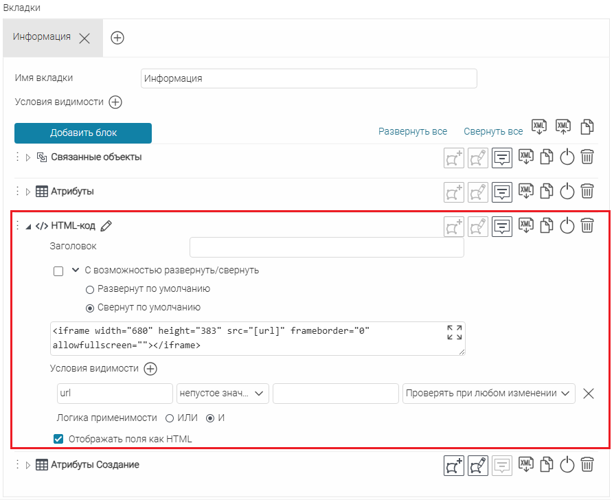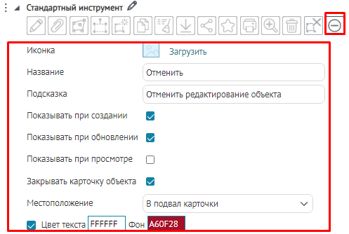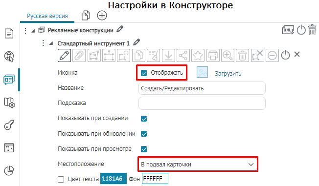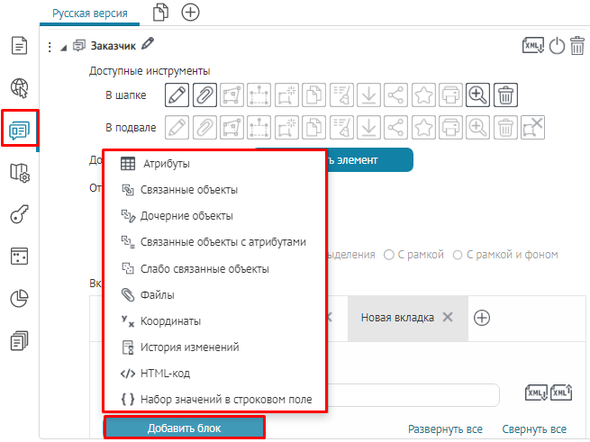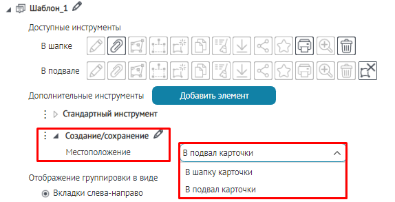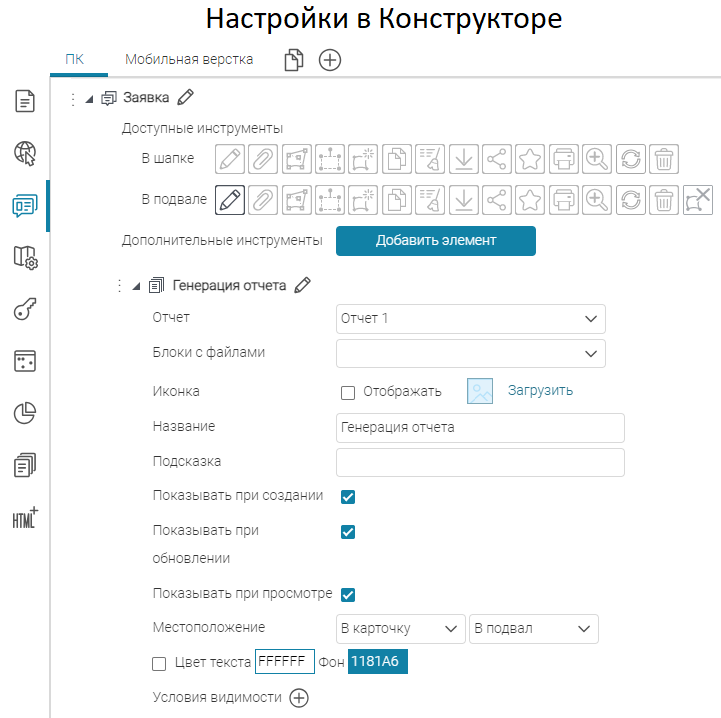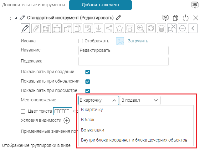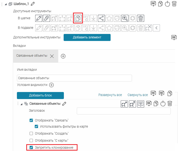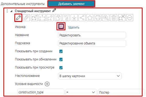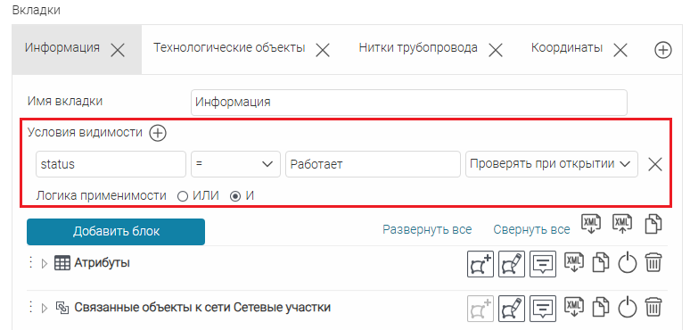 Для вкладок, блоков, кнопок вызова инструментов или специальных кнопок создания или сохранения объектов укажите, в какой момент проверять заданное условие: